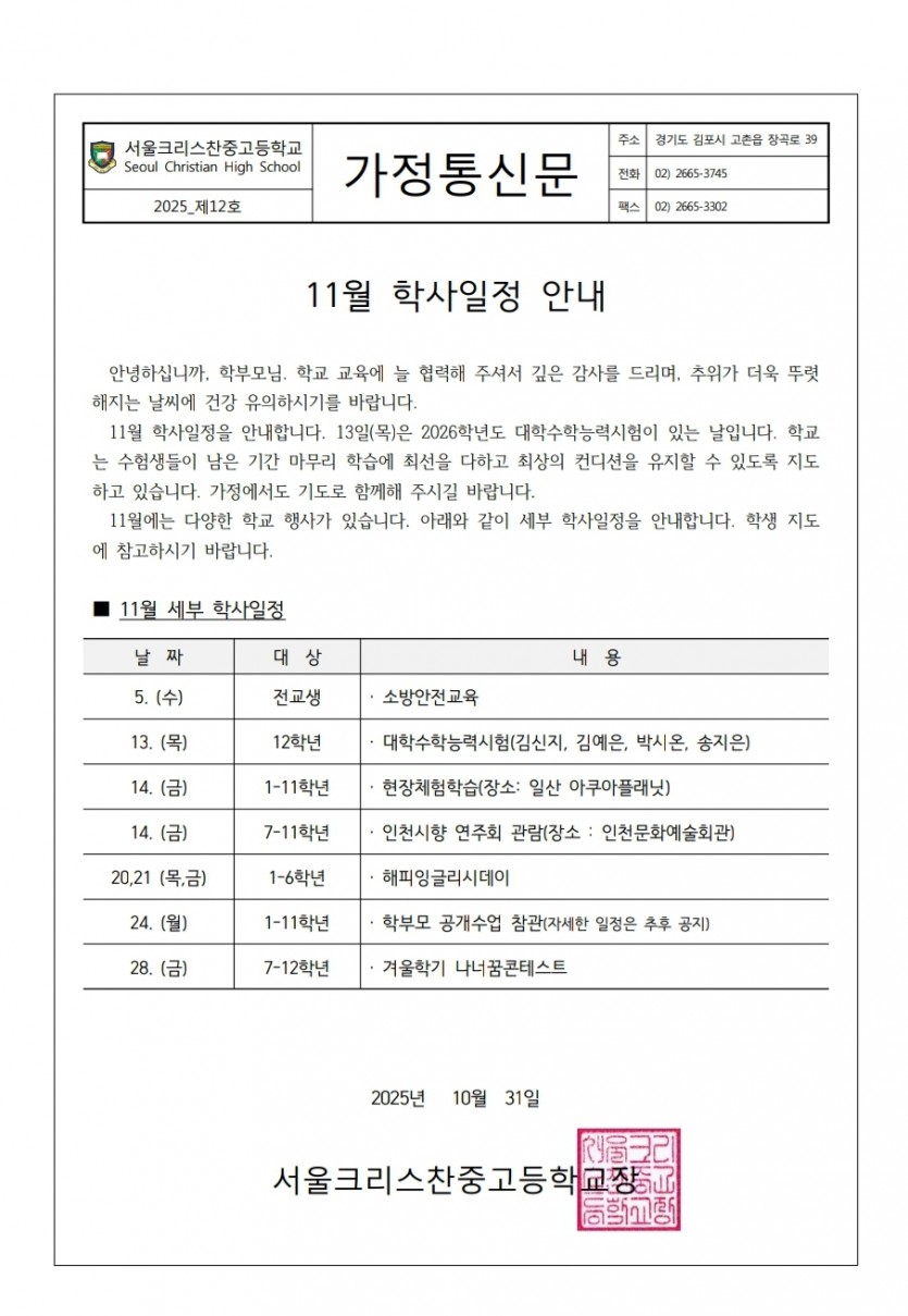 2025학년도 11월 학사일정을 알려 드립니다.