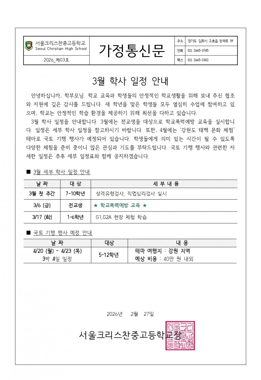 안녕하십니까. 2026학년도 3월 학사일정을 올려드리오니 참고하시기 바랍니다.